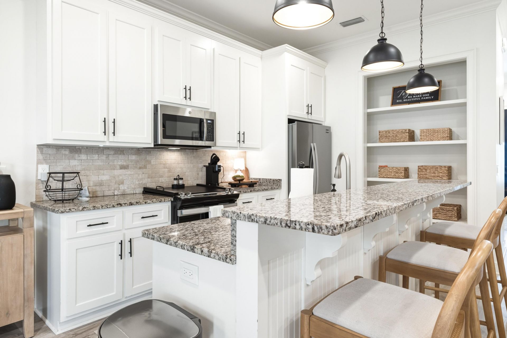 Fully renovated and move-in ready, this exceptional 4BR/4BA Villa Lago residence completed a full interior renovation in 2025 and delivers turnkey living with style, functionality, and value.The main level features light, premium LVP flooring throughout the living areas and staircase, enhancing the bright, open feel of the home. Fresh neutral interior paint in Swiss Coffee, updated lighting, and designer finishes create a clean, modern aesthetic. A versatile main-level bedroom with a nearby full bath is ideal for guests or flexible living. The spacious living room offers ample room for entertaining and flows seamlessly to a private patio, perfect for morning coffee, evening cocktails, grilling, or casual gatherings. Cont'd The updated kitchen includes all-new 2024 stainless steel appliances including refrigerator, dishwasher, and range/oven. A renovated pantry with custom floating shelves provides modern, open storage while maintaining a sleek look.Upstairs, all three bedrooms feature private en suite bathrooms with no shared baths. The primary suite is a true retreat with a large walk-in closet, (bonus room) ideal for a home office, sitting area, or nursery, mounted TV with concealed wiring, and a spa-inspired bathroom with separate shower and jetted soaking tub. A convenient upstairs laundry room adds everyday practicality.Recent upgrades include HVAC replacement in 2020, water heater in 2025, washer and dryer in 2022, and a new motorized garage door opener in 2025. Additional interior improvements include LED recessed lighting, updated ceiling fans, Decora outlets and switches, contemporary black hardware, and new window treatments throughout.The full garage features show-quality epoxy flake flooring with a durable polyaspartic topcoat and fresh paint. The exterior was recently soft-washed and painted crisp white, delivering standout curb appeal while remaining fully HOA compliant.A rare value-add: the home is fully furnished with all-new 2025 furniture including beds, mattresses, dressers, nightstands, sofas, lamps, and décor. Simply bring your suitcase and move in.This is a rare opportunity to purchase a fully renovated, completely furnished Villa Lago home without the delays, costs, or stress of renovations or furniture shopping. Ideal as a primary residence, second home, or investment property.