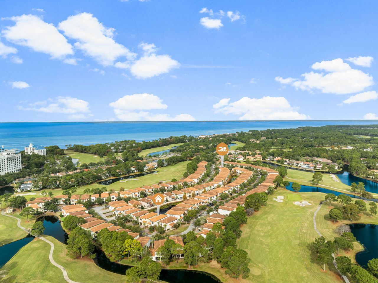 Welcome to this exquisite Mediterranean home in the Villa Lago community of Sandestin Resort. Sold fully furnished with a 2020 six-person golf cart, this custom residence is ideal for personal use or vacation rentals.With four spacious bedrooms and four bathrooms, the home accommodates up to 14 guests. Enter into a modern living room with soaring ceilings, perfect for entertaining. The galley-style kitchen features new appliances and a charming backsplash, seamlessly connecting to the living area. A convenient main floor bedroom is perfect for guests.The master suite boasts a jetted jacuzzi tub and a lighted walk-in shower. Upstairs, three oversized bunk beds sleep six children, along with an entertainment area.Enjoy tranquil pond views from the covered porch while grilling.